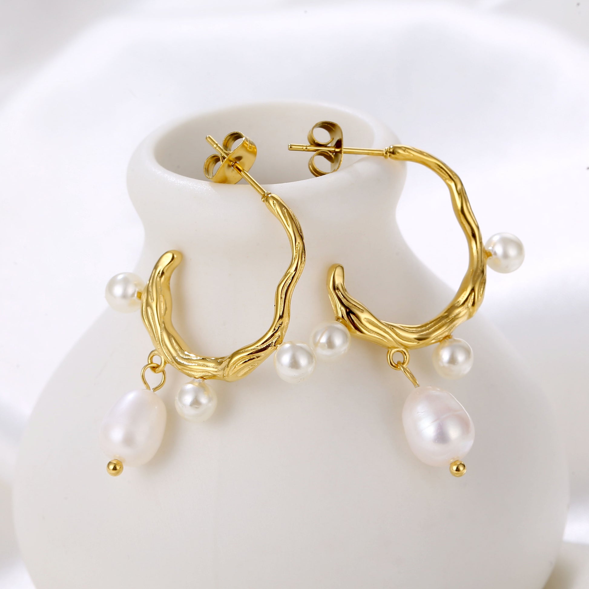 Organic Pearl Drop Hoop Earrings 18K Gold Plated Stainless Steel
